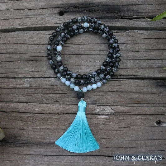 108 Natural Obsidian Snowflake, Aquamarine & Lava Stone Mala Prayer Beads