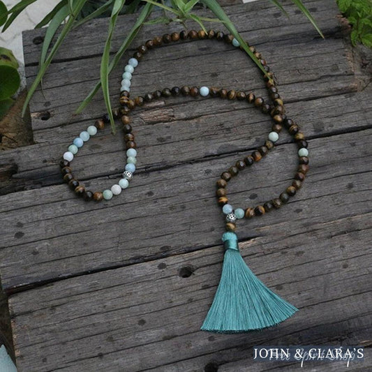 108 Natural Tiger Eye & Aquamarine Mala Bead Necklace