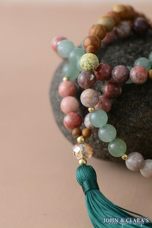 108 Natural Wood Jasper & Pink Jasper Mala Bead Necklace