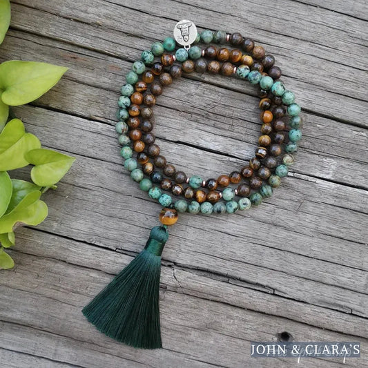 108 Natural Tiger Eye Bronzite & African Turquoise Mala Beads