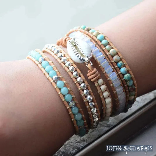 Handmade Natural Amazonite & Howlite Shell Leather Wrap Bracelet