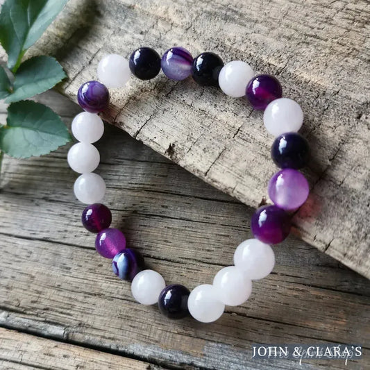 Purple Stripe Onyx Rose Quartz & Amethyst Elastic Bead Bracelet