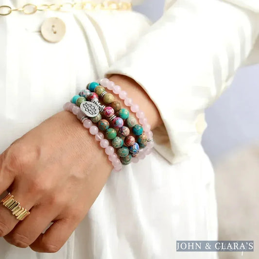 108 Rose Quartz, Turquoise & Purple Jasper Mala Bead Bracelet