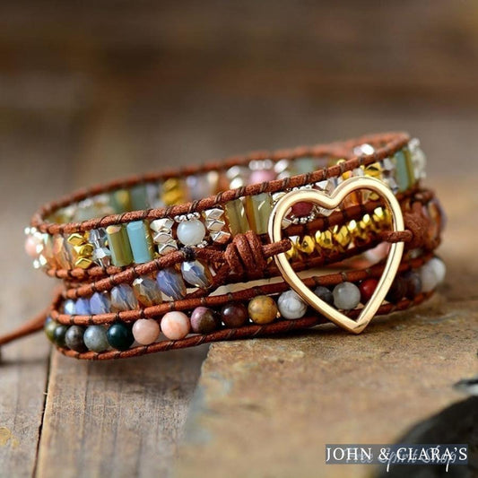 Mixed Gemstones & Heart Charm Wrap Bracelet