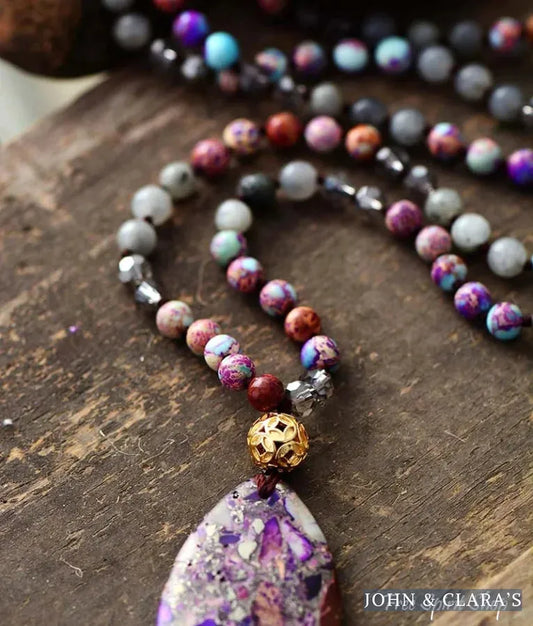 108 Purple Jasper Amazonite & Agate Hamsa Hand Mala Bead Necklace