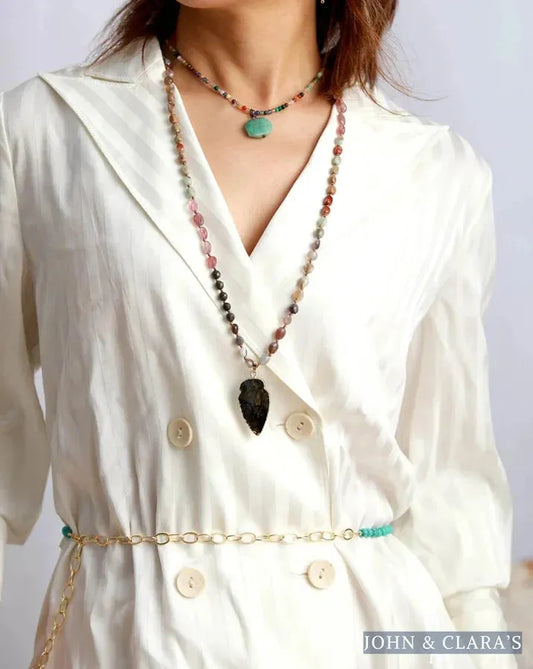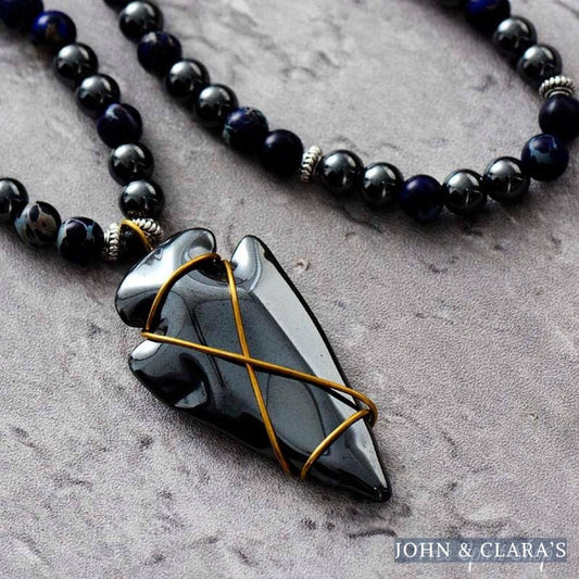 Natural Hematite & Blue Jasper Beaded Necklace With Arrowhead Pendant