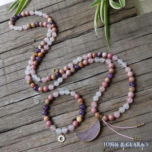 108 Natural Rhodonite Rose Quartz & Amethyst Moon Mala Beads