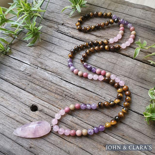 108 Natural Rose Quartz Tiger Eye Amethyst & Rhodonite Mala Bead Necklace