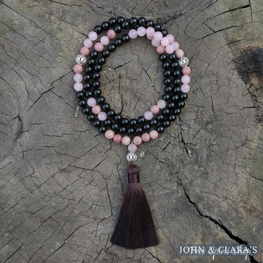 108 Natural Black Onyx Rhodonite & Rose Quartz Mala Beads