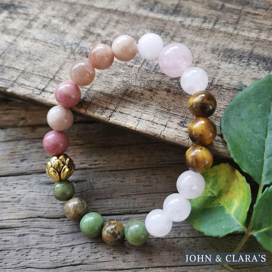Natural Rose Quartz African Turquoise Tiger Eye Sunstone & Rhodonite Bead Bracelet