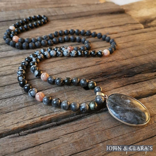 108 Natural Black Lava Stone Snowflake Obsidian Sunstone & Labradorite Mala Bead Necklace