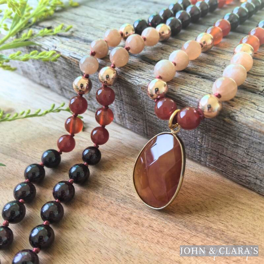 108 Natural Carnelian, Garnet & Sunstone Mala Bead Necklace