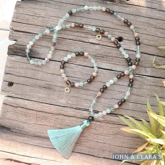 108 Natural Sunstone Fluorite & Smoky Quartz Mala Bead Necklace / Bracelet