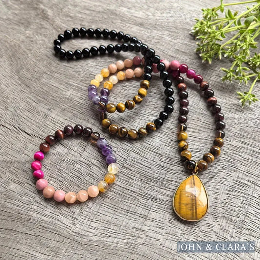 108 Natural Tiger eye, Citrine, Garrnet, Sunstone & Amethyst Mala Bead Necklace