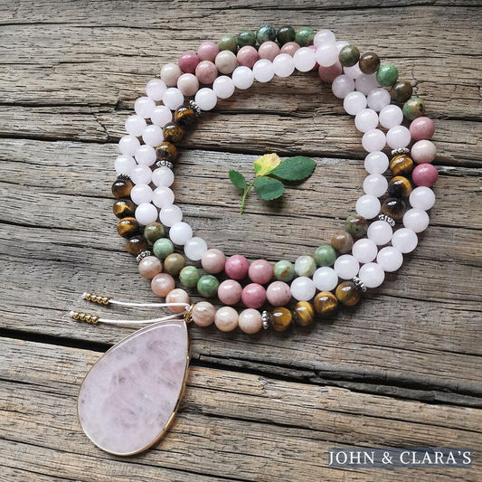 108 Natural Rose Quartz African Turquoise Tiger Eye & Rhodonite Mala Stone Bead Necklace