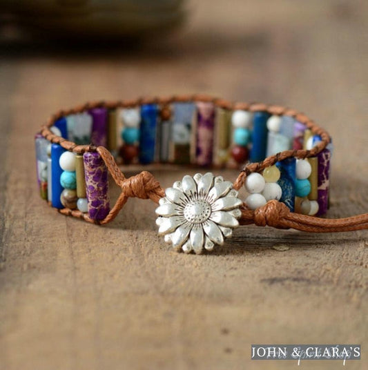 Handmade Natural Gemstone Sunflower Leather Wrap Bracelet
