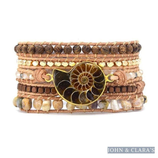 Natural Ammonite Fossil, Sunstone and Wood Beaded Wrap Bracelet