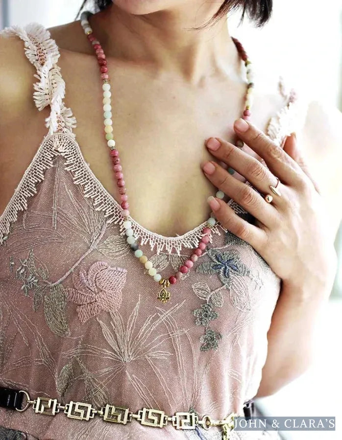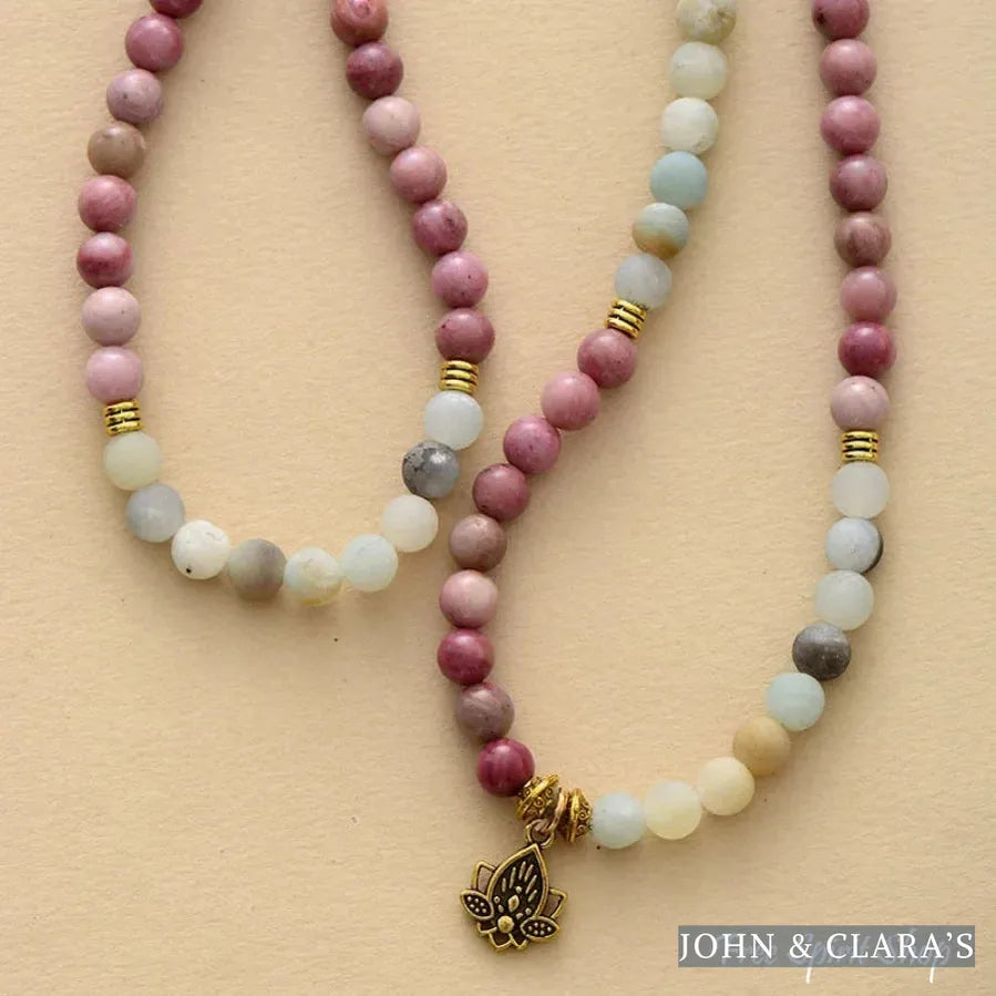 108 Natural Amazonite & Rhodonite Mala With Lotus Flower Charm