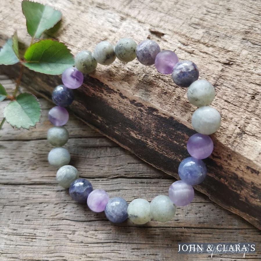 This splendid mala prayer bead necklace is carefully handmade with 108 natural Cordierite, Amethyst and Labradorite stone beads. It features a Labradorite pendant. Your mala can be worn as a necklace or used for meditation. The beads are 8 mm. Length is about 34 inches (88 cm). Bracelet length is about 18.5 cm. Make your selection between the necklace, the bracelets or the set in the dropdown menu above.