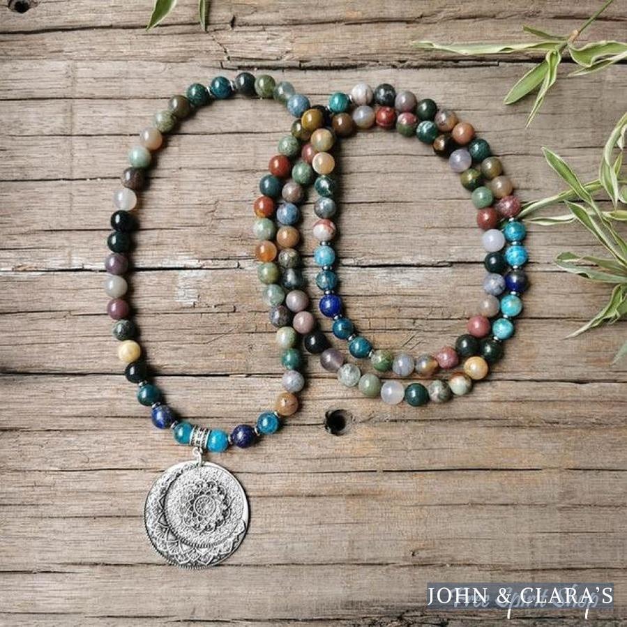 This splendid mala prayer bead necklace / bracelet is carefully handmade with 108 natural Indian Onyx and Blue Apatite gemstone beads. It features a beautiful spiritual pendant of your choice. Your mala can be worn as a necklace or used for meditation. The beads are 8 mm. Length is about 35 inches (91 cm). Bracelet length is about 18.5 cm. Make your selection between the necklace, bracelet or necklace & bracelet set using the drop-down menu above.