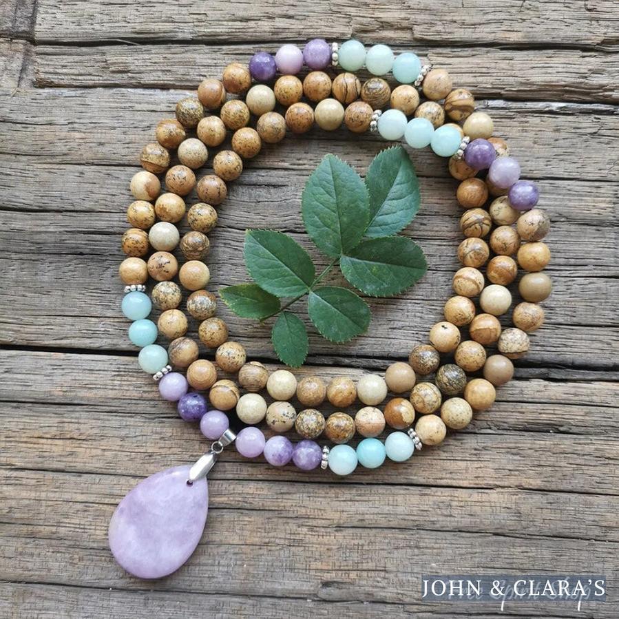 108 Natural Picture Jasper Amazonite & Lepidolite Mala Bead Necklace