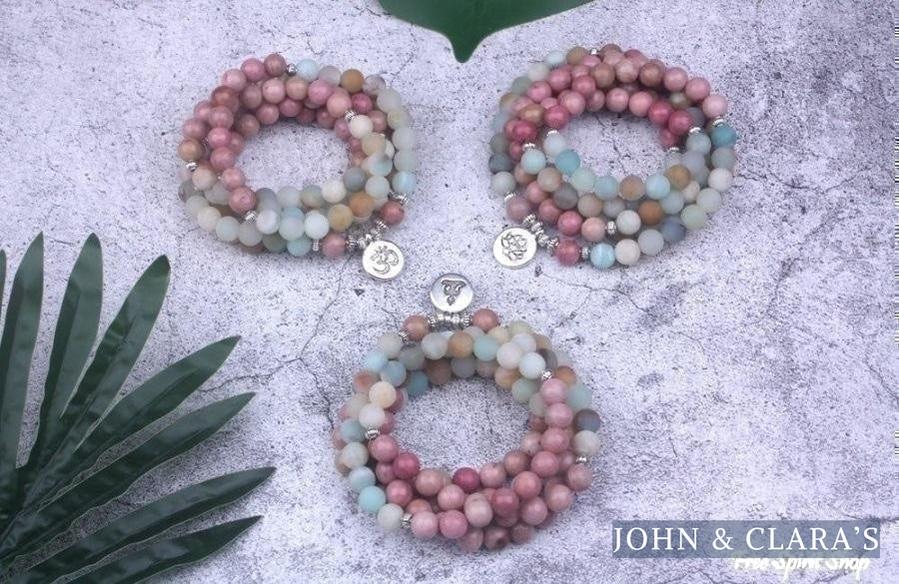 This splendid Mala bracelet is carefully handmade with 108 natural genuine matte Amazonite and Rodhonite gemstone beads. It can be worn as a bracelet, necklace or used for meditation. Length is about 23.6 inches (60 cm) and is elastic. 3 charms available, pick your fav!