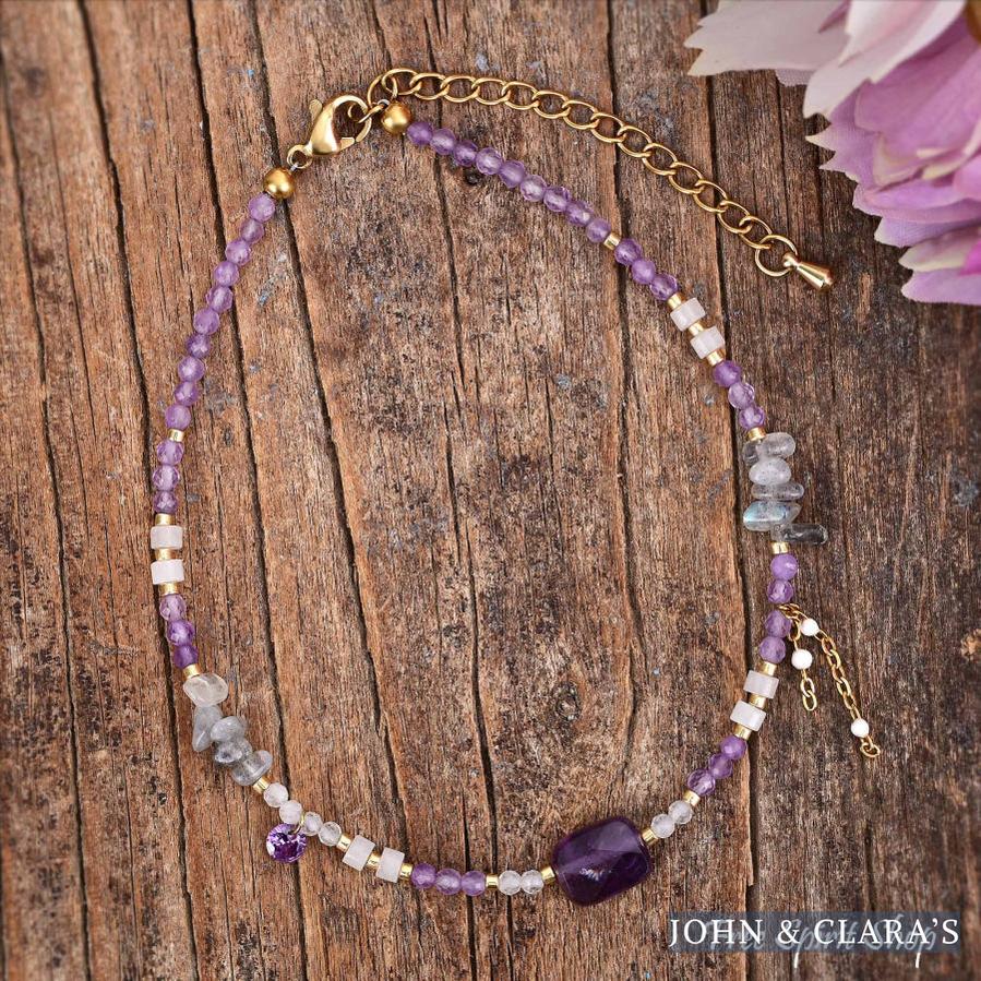 Infused with mystical charm, this boho-inspired anklet features a captivating blend of natural Amethyst and Labradorite beads. The rich purple hues of Amethyst bring a sense of peace and intuition, while the subtle flashes of Labradorite add a touch of magic. Accented with delicate details and an adjustable chain, this anklet is perfect for adding a dreamy, nature-inspired vibe to your look.