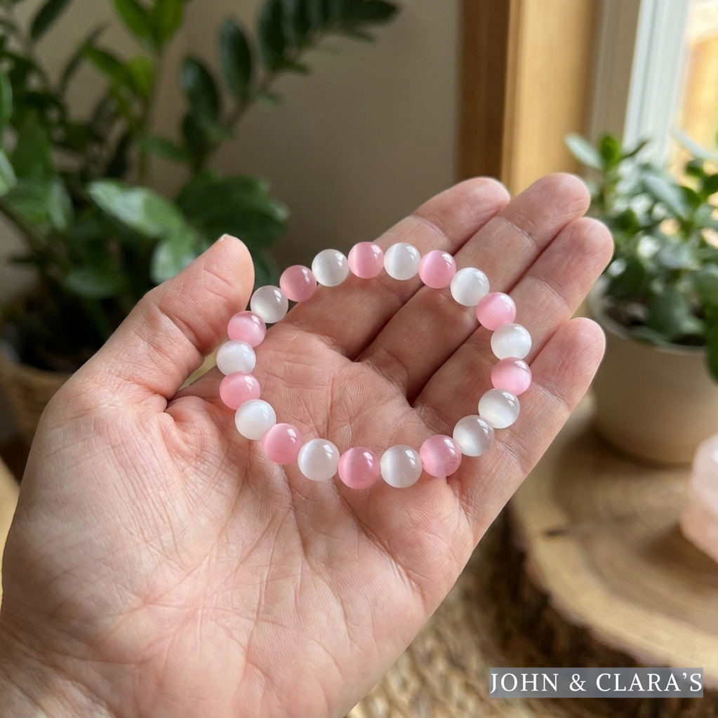 • Alternating pink and white beads with cat's eye shimmer (8mm)