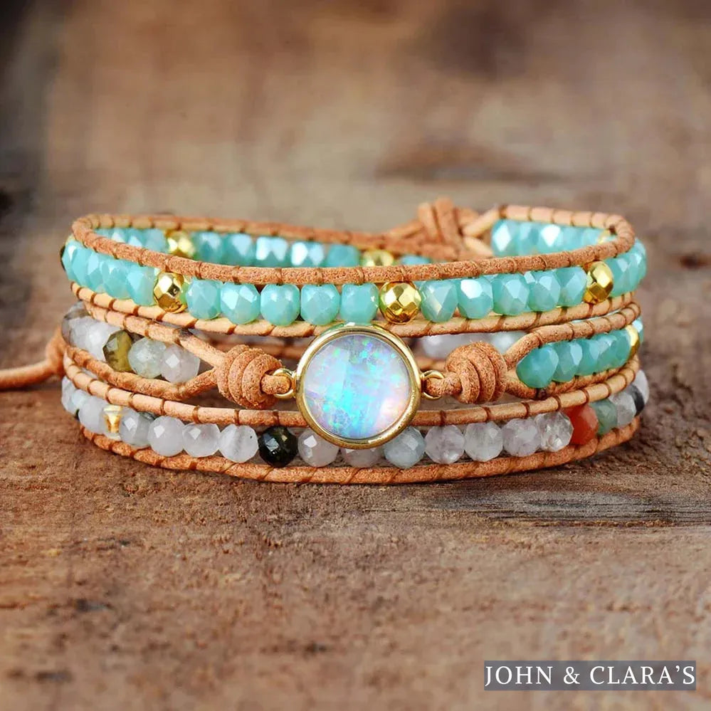 This wonderful bracelet is beautifully handmade with a mix of natural Clear Quartz and Agate beads. It features a beautiful Opal Rhinestone center-piece. The wrap bracelet is made with genuine leather. The total length is approximately 50 cm (19.6 inches) and can be adjusted to our wrist size via the different 3 closures.