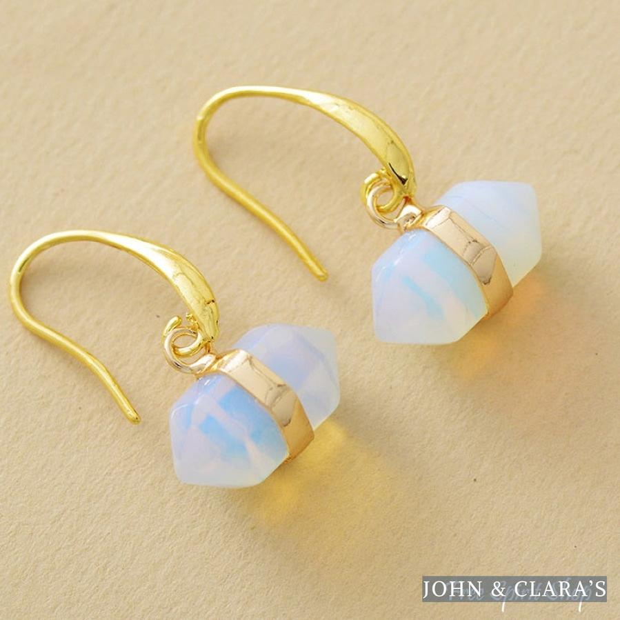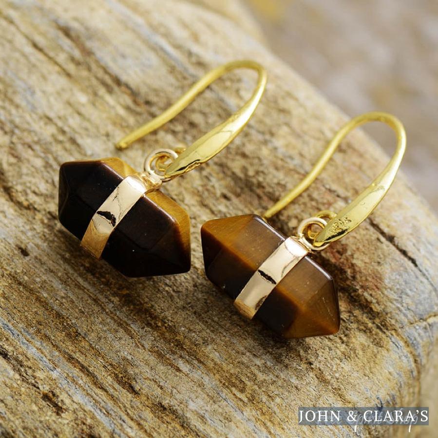 These wonderful hexagonal earrings are beautifully handmade with Amethyst gemstones. Total length is approximately 3 cm. Also available in natural Tiger Eye stone or Opal.