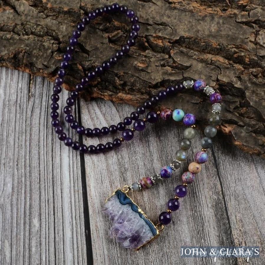 This splendid beaded necklace is beautifully handmade with natural semi-precious Amethyst, Labradorite and Jasper gemstone beads as well as a natural Amethyst druzy pendant. These gemstones have wonderful healing properties. Length is about 26 inches (66 cm).