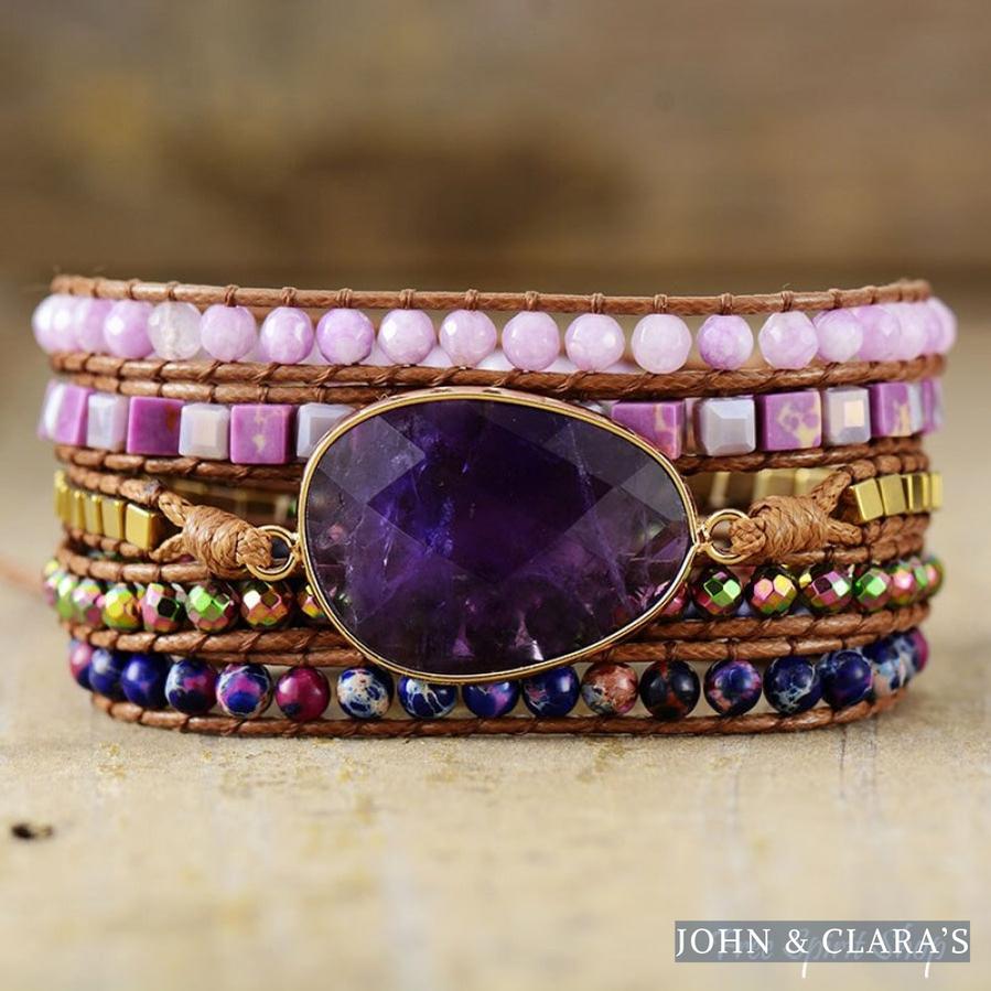 This splendid Amethyst & Purple Quartz wrap bracelet is the perfect piece of jewelry for third eye chakra opening, strength and grounding. It features a beautiful Amethyst center-piece. It is 32 inches (83.5 cm) long and is adjustable to your wrist.