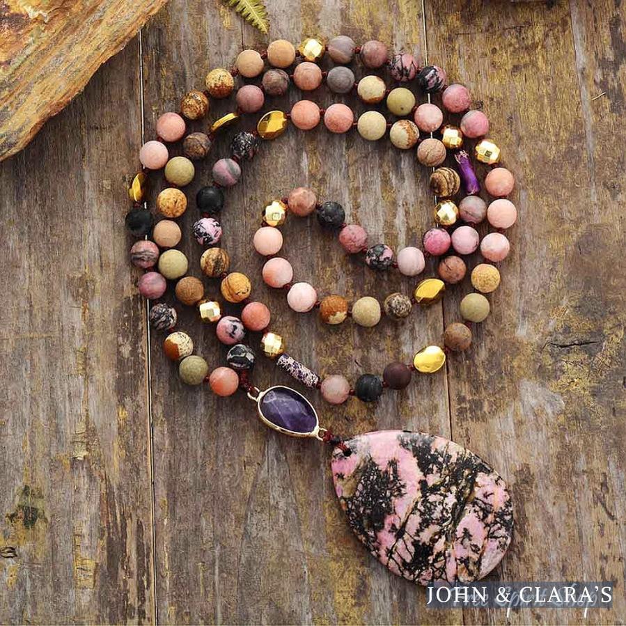 This splendid beaded necklace is carefully handmade with natural Rhodonite and Jasper beads. It features a beautiful Rhodonite pendant. Length is around 33.5 inches (85 cm). This necklace is beautifully hand-knotted.
