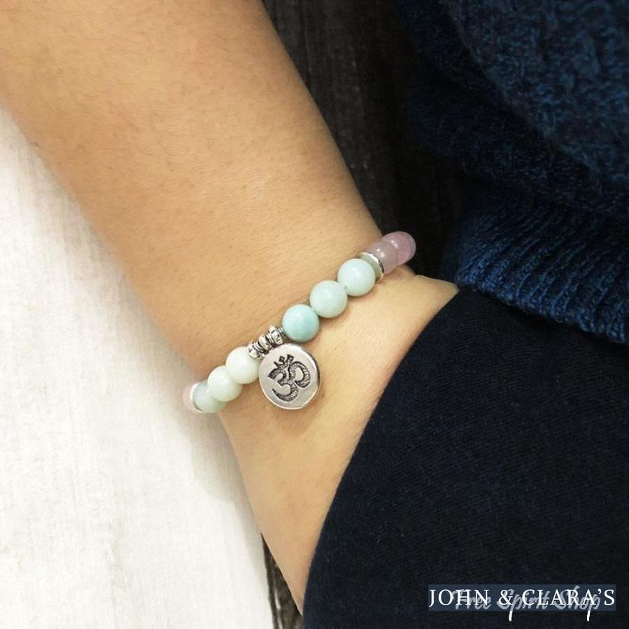 This splendid mala bracelet is carefully handmade with natural Rose Quartz & Amazonite gemstone beads. Length is approximately 18 cm. Choose your favorite zen charm: Ohm, Buddha or Lotus symbol.