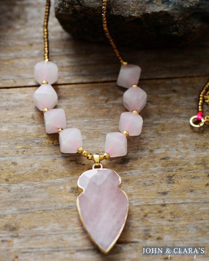 Natural Rose Quartz Diamond Shaped Pendant Necklace
