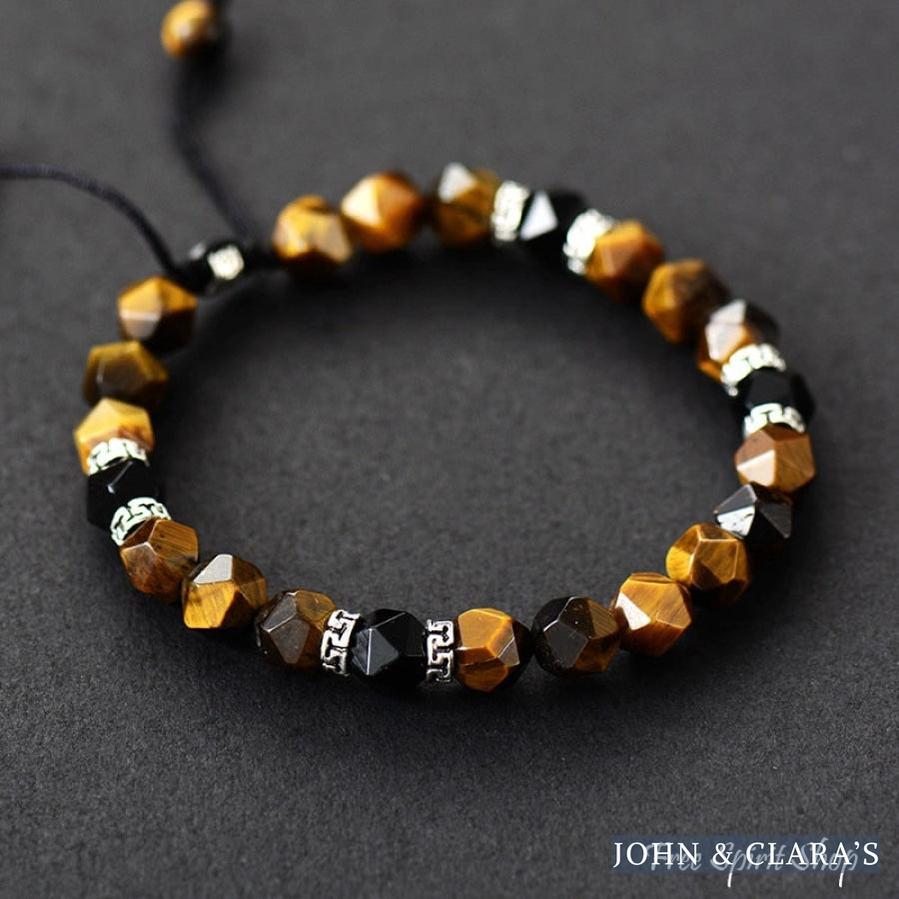 This splendid beaded bracelet is carefully handmade with natural Black Onyx and Tiger Eye faceted gemstone beads. It is unisex and there are two lengths available: 17cm or 19cm. Both sizes are adjustable. Vegan friendly.