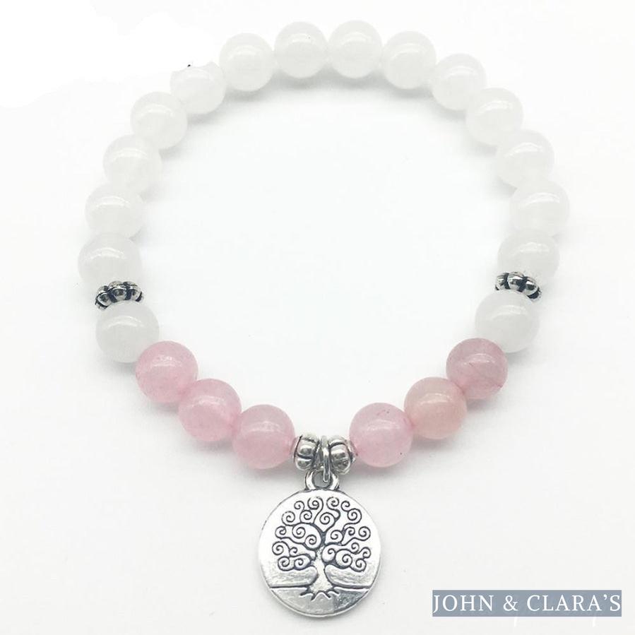 This splendid mala bead bracelet is carefully handmade with natural genuine Rose Quartz and White Jade stone beads as well as a Tree Of Life charm. Length is about 19 cm. The charm represents the Tree of Life symbolizing wisdom, strength and protection.
