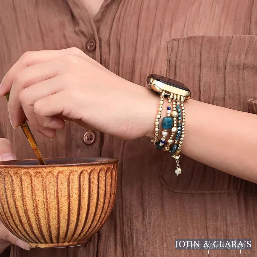 Bring vibrant charm to your Apple Watch with our Ocean Blue Apatite Beaded Apple Watch Band with Clover Charm. Designed with a mix of Blue Apatite gemstone beads, faceted crystals, and accents, this unique band blends natural beauty with everyday elegance.