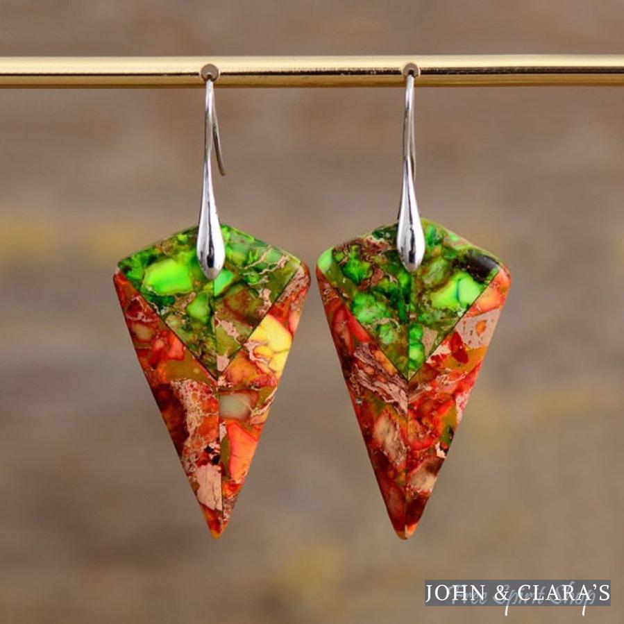 These wonderful dangle earrings are beautifully handmade with multi-color Jasper stones. Total length is approximately 4.5-5 cm. Two color options to choose from.